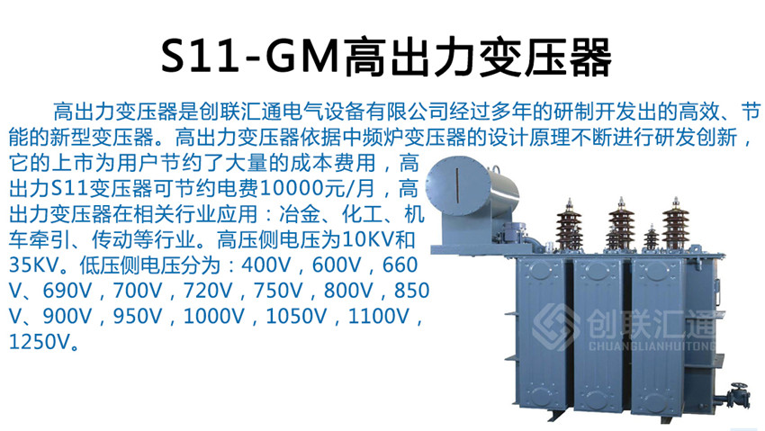 S11-GM高出力變壓器適用于冶煉廠、特別是鑄造廠、大型用電企業(yè)等,為用戶節(jié)省大量的固定電費(fèi),經(jīng)濟(jì)效益顯著。